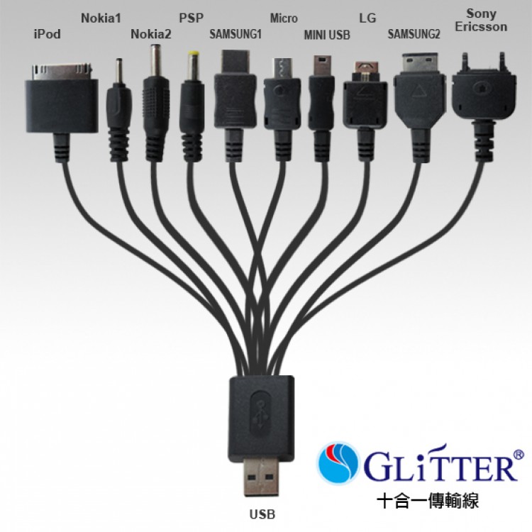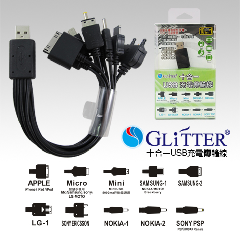 ♥ 篆楷/ 宇堂/ Glitter ♥_10合1線_萬能充電線_手機USB充電線_十合一_iPhone_HTC_SAMSUNG_Nokia_iPod_iPad_LG_充電器