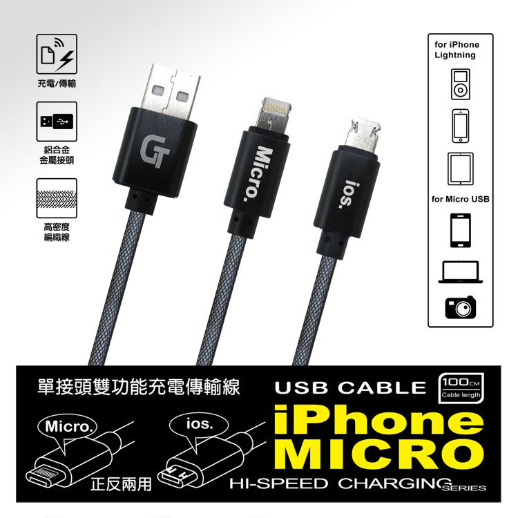 GT-2091 iPhone+MICRO USB單接頭雙功能傳輸線-黑