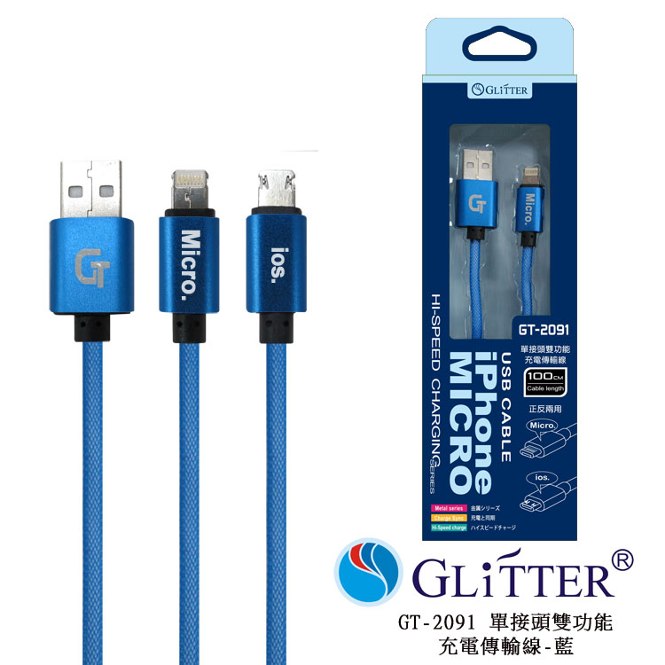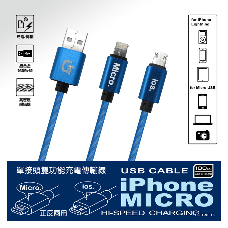 GT-2091 iPhone+MICRO USB單接頭雙功能傳輸線-藍