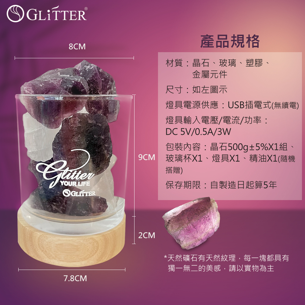 包裝內容:晶石x1組、玻璃杯x1、燈具x1、精油x1(隨機搭贈)