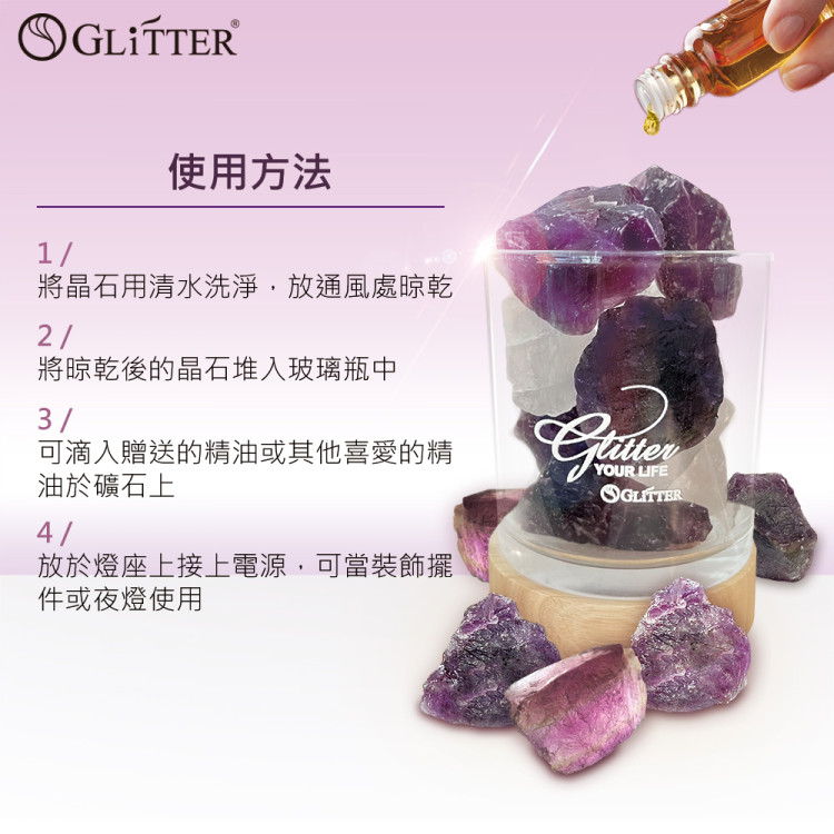 ●可將晶石依自己喜好擺放入玻璃杯(可添加精油),放在燈具上,接上電源,可當裝飾擺件或夜燈使用。