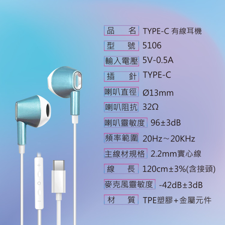 產品名稱:TYPE-C 入耳式耳機麥克風 產品型號:GT-5106 產品規格 輸入電壓:5V-0.5A