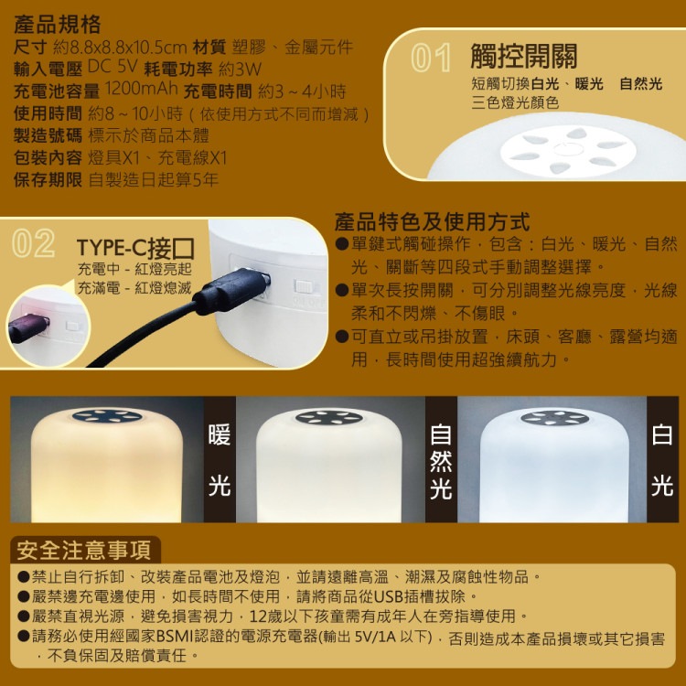 ●單鍵式觸碰操作,包含:白光、暖光、自然光、關斷等四段式手動調整選擇。